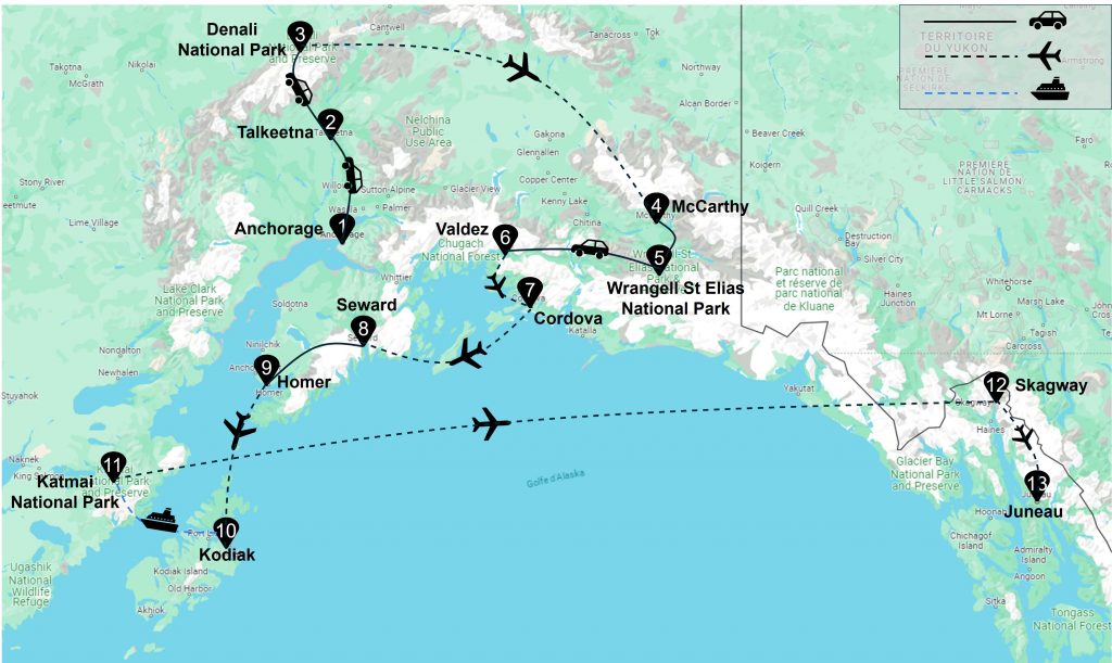 Alaska : rien que le nom fait rêver ! Cet itinéraire de 27 nuits en vous permettra de découvrir de manière approfondie cet État spectaculaire, ses parcs nationaux et ses paysages époustouflants.